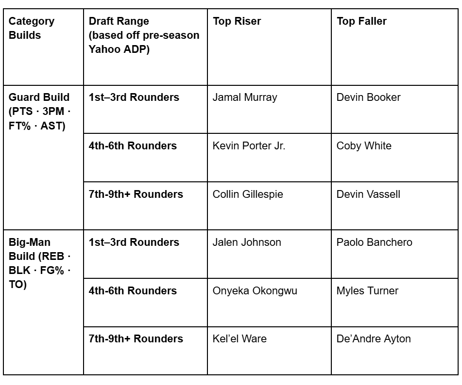 Guard Build – Teams built around high-usage ball-handlers who drive Points, Assists, Threes, FT% (and usually punt turnovers).
